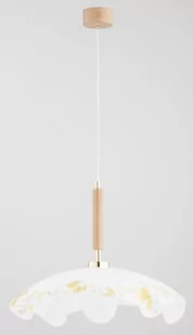 Lampa wisząca 1 punktowa ze szklanym kloszem. Elementy metalowe wykończone w kolorze złotym połączone z elementami drewnianymi w kolorze naturalnym. Możliwość regulowania wysokości.