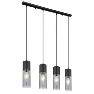 4 x E27 To gniazdo jest odpowiednie dla źródeł światła o klasach efektywności energetycznej do E Źródła światła nie wchodzą w zakres dostawy Ta prosta lampa wisząca z serii Annika wyróżnia się kolorystyką i wzornictwem. Cztery czarne kable biegną od smukłej czarnej metalowej obudowy (80x9 cm) do gniazda E27 z cylindrycznym kloszem z przydymionego szkła. Gniazda E27 zapewniają swobodny wybór barwy światła i jasności do maksymalnej mocy 25 watów. Inne modele z tej serii są doskonałym dodatkiem do Twojego salonu.