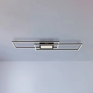 Prostokątna lampa sufitowa LED Saunders z efektem 3D Lampa sufitowa Saunders o podłużnym kształcie z dwoma przesuniętymi względem siebie prostokątami stanowi nowoczesne rozwiązanie oświetleniowe. Czarny metalowy korpus i aluminiowy klosz z czarnego, matowego i opalowego tworzywa sztucznego tworzą imponujący efekt 3D. Dzięki wysokiemu strumieniowi świetlnemu i regulowanej barwie światła (CCT) od ciepłej bieli do światła dziennego, lampa sufitowa LED Saunders nie pozostawia nic do życzenia. Dołączony pilot (w zestawie 2 baterie AAA), możliwość ściemniania za pomocą pilota lub przełącznika ściennego, zintegrowana funkcja pamięci i trzystopniowa przełączana lampka nocna zapewniają dodatkową wygodę - Zintegrowany wyłącznik czasowy