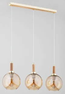 Lampa wisząca 3 punktowa ze szklanymi kloszami w kolorze transparentnym bursztynowym. Elementy metalowe wykończone w kolorze złotym w połączeniu z elementami drewnianymi w kolorze naturalnym. Możliwość skrócenia wysokości lampy.