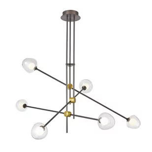 Lampa wisząca ROMILY PND-201883-6 to oryginalna konstrukcja świetlna złożona z 3 skrzyżowanych ze sobą ramion, zakończonych z obu stron szklanymi kloszami. Model posiada obudowę w kawowym kolorze, zdobioną złotymi elementami i transparentnymi kulami. Wewnątrz wbudowany został LED o temperaturze barwowej 3000 kelwinów, dzięki czemu lampa świeci ciepłą białą barwą. Model ma wysokość 90 cm oraz szerokość i długość 97 cm. Eleganckie połączenie kolorystyczne i ciekawa forma sprawiają, że lampa nada charakteru zwłaszcza nowoczesnym wnętrzom.