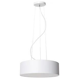 Producent: KASPA Materiał: metal, tkanina Kolor: biały Wymiary: średnica podsufitki 20cm, wysokość całkowita 178 cm, średnica abażura 58 cm, wysokość abażura 18 cm Rodzaj źródła światła: 3 x E27 Moc max.