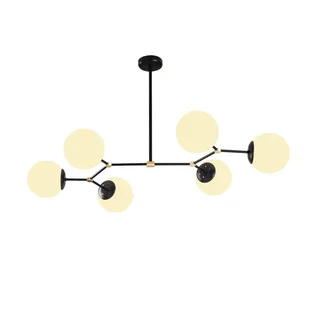 Sześciopłomienna lampa sufitowa Mulen do salonu i jadalni. Design w stylu skandynawskim, z czarną metalową konstrukcją i sześcioma kulistymi kloszami z opalowego szkła. Lampa sufitowa przeznaczona do oświetlania stołów w jadalni i salonie. Lampa posiada detale w kolorze złotym na konstrukcji: Wysokość 52 cm.