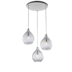 Lampa wisząca z lakierowanego na biało żelaza i chromowanej ramy z regulowanymi kablami elektrycznymi i przezroczystymi kloszami z dmuchanego szkła z dekoracją imitującą kryształ 3 światła - wys. 32 - maks. 132 - Ø45 Wymiary produktu: wys. 32 - maks. 132 - Ø45 Liczba żarówek: 3 X E27 Moc: maks. 55 W Wykończenie:
