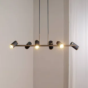 Lampa wisząca Lume w kolorze czerni i antycznego złota z sześcioma regulowanymi spotami Przekonująca pod względem funkcjonalnym i zaprojektowana w modnym połączeniu kolorystycznym czerni i antycznego złota lampa wisząca Lume wzbogaca pokoje dzienne i salony. Sześć spotów jest przymocowanych z boku poziomego pręta i można je skierować na wybrany obszar.