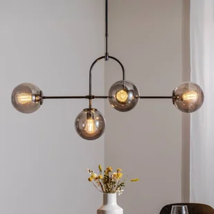 4-punktowa lampa wisząca Portemo z dymnoszarymi szklanymi kloszami i zawieszeniem w kolorze niklu Nowoczesna lampa wisząca Portemo jest wyposażona w cztery kuliste klosze, które są utrzymywane przez metalową konstrukcję w kolorze niklu. Przydymione szare szkło kloszy nadaje lampie wiszącej dekoracyjny charakter, który można idealnie uzupełnić żarówkami o filamentowym wyglądzie.