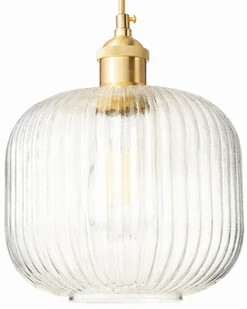 PRZEZROCZYSTA LAMPA O RYFLOWANEJ FORMIETen wyjątkowy model wyróżnia ryflowana forma (falowane szkło) i aluminiowa oprawa w kolorze złota