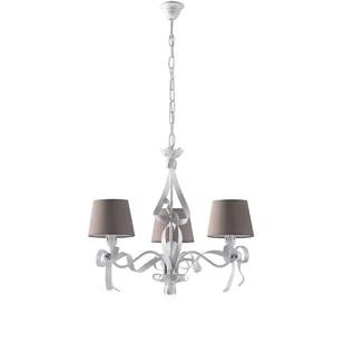Biały lakierowany żyrandol z żelaza z dekoracją w stylu shabby chic i kloszami z tworzywa sztucznego w kolorze gołębiej szarości o średnicy 16 cm, 3 światła - wys. 53 cm - maks. 113 cm - Ø59 cm Wymiary produktu: wys. 53 cm - maks. 113 cm - Ø59 cm Liczba żarówek: