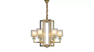 Przyglądając się bliżej kolekcji MANHATTAN, dostrzec można, że jej stonowany charakter jest tylko pozorny, a w modelach tej serii wiele się dzieje - poczynając od liczby źródeł światła, przez ciekawą konstrukcję, aż po liczne zdobienia. Bryła lampy wiszącej wykonana została w większej części z metalu w kolorze złotym. Charakterystyczna jest tutaj geometryczna struktura połączonych prostokątów, tworzących przeplatające się ze sobą ramki. Z centrum kompozycji wyłania się sześć złotych ramion wygiętych ku górze, które kończą się szklanymi podstawami pod oprawy w kształcie kwadratów. Na nich spoczywają klosze wykonane z podwójnych szklanych ścianek - wewnętrznej mlecznej oraz zewnętrznej przezroczystej, które w niezwykle oryginalny sposób oddają światło do pomieszczenia - jej subtelna elegancja umożliwia zastosowanie jej w bardziej ekskluzywnym miejscu, jakim jest restauracja czy sala bankietowa.