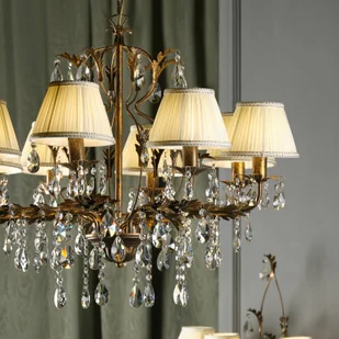 8-punktowy żyrandol Karen z brązu z kryształami Ten 8-punktowy żyrandol Karen zachwyca swoim antycznym urokiem. Rama z pięknymi ornamentami z liści i mnóstwem kryształów wykonana jest z metalu w kolorze brązu. Każda z ośmiu opraw jest przykryta marszczonym, lekko zwężającym się kloszem z tkaniny z piękną lamówką u góry i u dołu, co zapewnia nieoślepiające światło.