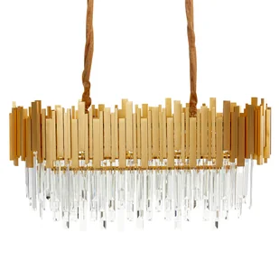 Elegancki żyrandol z kryształkami. Ten elegancki żyrandol ma aluminiową ramę w złotym kolorze, która podkreśla jego luksusową strukturę. Ozdobiony jest dekoracyjnymi szklanymi kryształami, które pięknie odbijają światło i dodają finezji każdemu salonowi lub jadalni. Żyrandol można regulować pod względem wysokości i długości kabla, dzięki czemu można go dowolnie zaaranżować. Przewód jest pokryty materiałem w złotym kolorze, który podkreśla estetykę.