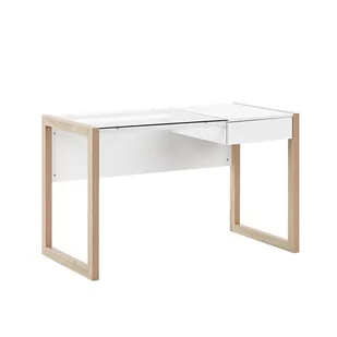 Skandynawskie biurko z szufladą i szklanym blatem Dodaj skandynawskiego stylu do swojego biura domowego za pomocą tego minimalistycznego biurka. Wykonane z trwałej i łatwej w utrzymaniu płyty wiórowej, nie wymaga codziennej pielęgnacji, by zachować swój wygląd na wiele lat. Poza byciem wytrzymałym jest to też świetne miejsce do przechowywania, dzięki wbudowanej i pojemnej szufladzie, w której schowasz dokumenty i inne niezbędne przedmioty. Całą konstrukcję podkreśla szklany blat, który dodaje nowoczesnesności do produktu. Szczegóły: Kolor: Biały, Jasne drewno.