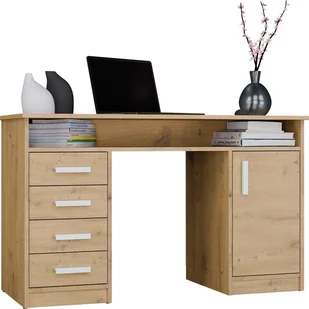 BIURKO Z 4 SZUFLADAMI, 1 DRZWIAMI I PÓŁKĄ POD BLATEM MODEL: ADA Kolor: DĄB ARTISAN Wyposażone w 4 szuflady oraz zamykany 1 drzwiami schowek z 2 półkami, zapewnia dużo miejsca do przechowywania dokumentów, książek czy akcesoriów biurowych. Dodatkowa otwarta półka pod blatem idealnie sprawdzi się na drobne przedmioty, laptopa czy zeszyty. GŁÓWNE CECHY: 4 pojemne szuflady – zapewniają mnóstwo miejsca na dokumenty, akcesoria biurowe oraz inne niezbędne przedmioty.