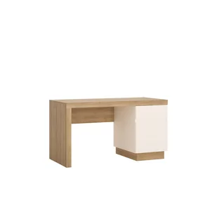 Biurko LYOB01 LYON JElegancko wyglądające biurko z kolekcji Lyon Jasny to wspaniały i funkcjonalny mebel, który stanie się dopełnieniem nowocześnie urządzonego wnętrza. Ciepła i naturalna paleta barw, którą tworzą Dąb Riviera na korpusie i połyskliwa biel na froncie daje możliwość stworzenia przyjemnego kącika do nauki lub pracy. Funkcjonalność mebel zawdzięcza pojemnej szufladzie wyposażonej w system cichego domyku oraz przestronnej szafce, która jest idealna do przechowywania wszystkiego, co potrzebne do nauki lub pracy. Nowatorski i wygodny system bezuchwytowego otwierania, oraz cichy domyk i spowalniacze szuflad gwarantują komfort i bezpieczeństwo codziennego użytkowania. Cechy produktu: