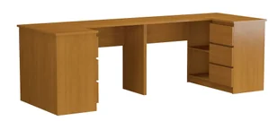 dwa przestronne, narożne blaty oferują komfort pracy i nauki dla dwóch osób jednocześnie3 szuflady i 2 otwarte półki po każdej stronie zapewniają efektywną organizację przestrzeninarożna forma biurka zapewnia duże możliwości aranżacyjne, przystosowując się do różnych potrzebminimalistyczny design mebla sprawia, że będzie pasować do każdego wnętrza, nie zaburzając aranżacji Perfekcja w każdym detalu: wysokiej jakości, laminowana płyta meblowa o podwyższonej trwałości i gęstość około 684 kg/m3 zapewnia wytrzymałość i odporność na zniszczeniabrzegi oklejone specjalistycznym materiałem ABS, który gwarantuje ochronę przed uszkodzeniami mechanicznymi i podnosi trwałość meblametalowe prowadnice rolkowe zastosowane w szufladach zapewniają płynne otwieranie i zamykanie oraz bezpieczne użytkowanie Biurko jest dostępne w poniższych wersjach kolorystycznych. Kliknij w link i sprawdź kolory biurka . Najważniejsze informacje: Wymiary całkowite: