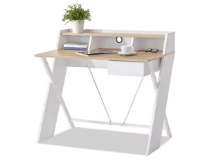 cechy blat prostokątny, z półką nadstawna, z szufladami Kolorystyka kolor blatu: dąb sonoma kolor korpusu: dąb sonoma, biały kolor podstawy: biały kolor półek: dąb sonoma przeznaczenie biuro, lokal usługowy, pokój dziecka, pracowania w domu styl wnętrzarski nowoczesny, skandynawski Wymiary i waga długość: