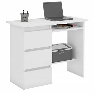 BIURKO KOMPUTEROWE SZKOLNE POD LAPTOP BETA 2 LEWE BIAŁE 3 kolory do wyboru! Nieduże, szkolne biurko w nowoczesnej stylistyce. Wyprodukowane w Polsce W zestawie z instrukcją i niezbędnymi akcesoriami Biurko do ustawienia pod ścianę, nieobrobione z tyłu Biurko do samodzielnego montażu Wybrane zalety biurka: Wykonane z wysokiej jakości płyty laminowanej o grubości 18mm odpornej na ścieranie i zarysowania, oklejone obrzeżem ABS o grubości 0,6mm 3 pojemne szuflady Wysuwana półka na klawiaturę Półka na drukarkę Wersja PRAWA widoczna na zdjęciu obok, dostępna jest na pozostałych naszych aukcjach. Kolorystyka i wymiary Wymiary: -szerokość 94cm -głębokość 43cm -wysokość 75cm Wymiar półki na klawiaturę: