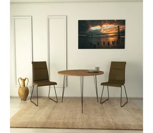 Okrągły stół jadalniany, który jest doskonałym dodatkiem aranżacyjnym do Twojej jadalni. Dzięki prostemu, nowoczesnemu stylowi pasuje do każdego domu. Wykonany z laminowanej płyty wiórowej, nogi z metalu. Połączenie drewna i czarnego metalu. Grubość materiału: