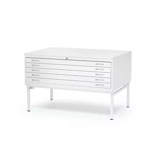 Stylowa szafka na rysunki z zamykanymi szufladami w formacie A0. Posiada nóżki oraz korpus wykonany z blachy stalowej z blatem ze stali lub laminatu. Solidna szafka na rysunki z malowanej na biało blachy stalowej zapewnia bezpieczne i wydajne przechowywanie rysunków w rozmiarze A0 lub mniejszym. Szuflady ochronią rysunki, ułatwiając utrzymanie porządku w biurze i znalezienie odpowiedniego rysunku, gdy go potrzebujesz. Dzięki eleganckiemu, stylowemu wzornictwu szafka wpasuje się w każde środowisko biurowe. Doskonale nadaje się do ustawienia w środku pomieszczenia lub przy ścianie.