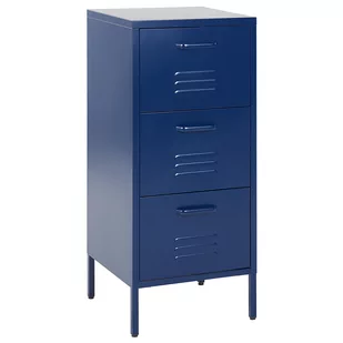 Stalowa szafka z szufladami. Dzięki swojej smukłej konstrukcji ta szafka zmieści się w każdym pomieszczeniu, pomagając ci zmaksymalizować przestrzeń do przechowywania. Mebel w kolorze ciemnoniebieskim wykonany jest z metalu, dzięki czemu jest nie tylko solidny i stabilny, ale także wyjątkowo łatwy w pielęgnacji. Wąskie otwory na frontach zapewniają odpowiednią cyrkulację powietrza, dzięki czemu model sprawdzi się jako szafka w domowym biurze czy industrialna komoda w sypialni. Szczegóły: Typ produktu:
