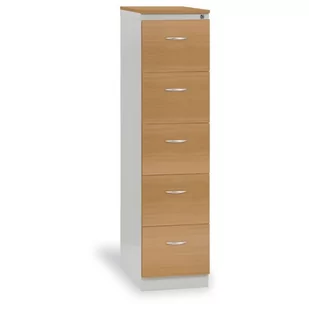 Szafa kartotekowa z blachy stalowej, front i górna płyta z płyty wiórowej laminowanej, szuflady na prowadnicach kulkowych teleskopowych z wysuwem 100%, system blokady szuflad, nośność szuflady 30 kg, zamek centralny, w stanie zdemontowanym. Ważne: Instrukcja montażu do pobrania