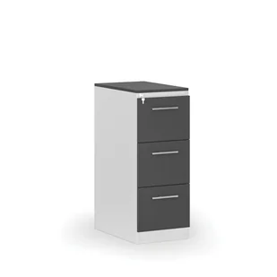 Szafa kartotekowa z blachy stalowej, front i górna płyta z płyty wiórowej laminowanej, szuflady na prowadnicach kulkowych teleskopowych z wysuwem 100%, system blokady szuflad, nośność szuflady 30 kg, zamek centralny, w stanie zdemontowanym. Ważne: Instrukcja montażu do pobrania