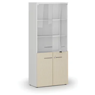 Szafy biurowe Szafa biurowa kombinowana PRIMO WHITE z drzwiami drewnianymi i szklanymi, 1781 x 800 x 420 mm, biały/brzoza