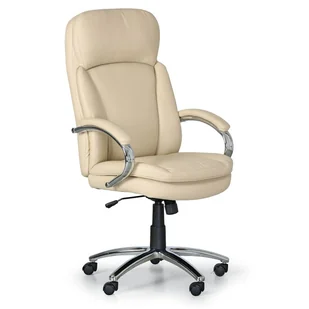 wygodny fotel tapicerowany eko skórą podłokietniki są metalowe z chromowanym wykończeniem, górna część jest obita ekologiczną skórą mechanizm bujania z regulacją regulacja wysokości za pomocą tłoka gazowego metalowy krzyż z chromowanym wykończeniem twarde koła do miękkich podłóg o średnicy 50 mm nośność150 kg