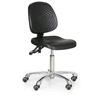 siedzisko wykonane z miękkiej pianki- odporny materiał, łatwe w utrzymaniu ruchome oparcie pod katem pleców siedzącego regulowana obręcz podpórkowa regulowana wysokość podstawa pięcioramienna, aluminiowa o średnicy 620 mm kółka uniwersalne na twarde i miękkie podłogi bezpieczne, chromowane stopki nośność 130 kg
