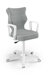 Krzesło młodzieżowe Norm tkanina Jasmine kolor szary Model Norm dopasowany do biurek o wysokości 70-82 cm. Krzesło obrotowe dla młodzieży jest ważnym elementem wyposażenia pokoju każdego nastolatka. Przygotowaliśmy dla naszych Klientów model Norm, którego siedzisko zostało wyprofilowane w ergonomiczny sposób, dzięki czemu użytkownik zyskuje maksimum wygody. Jesteśmy pewni, że nasz produkt spełni Twoje oczekiwania. Co wyróżnia krzesło obrotowe młodzieżowe Norm? • Ergonomiczne siedzisko wykonane z tworzywa sztucznego, • Stałe podłokietniki, również wykonane z tworzywa sztucznego, w białym kolorze • Blacha siedziska posiada stalową dźwignię prostą, dzięki czemu krzesło można sprawnie regulować, • Kolumna w postaci podnośnika gazowego ze stali oraz tworzywa sztucznego, • Teleskopowa osłonka na podnośnik gazowy, • Miękkie, białe kółka Zdrowe plecy, maksimum komfortu Wklęsło - wypukła forma oparcia zapewnia prawidłowe ułożenie kręgosłupa, dając użytkownikowi maksymalne odciążenie kręgosłupa.