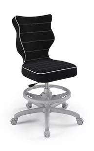 Krzesło dziecięce Petit z podnóżkiem tkanina Jasmine kolor czarny Model Petit z podnóżkiem dopasowany do biurek o wysokości 70-82 cm. Nowoczesne krzesło z podnóżkiem Petit z szarą podstawą jest innowacyjną propozycją. Cała seria charakteryzuje się głównym motywem przewodnim jakim jest ergonomiczny kształt i propagowanie zdrowej postawy podczas siedzenia. W jaki sposób to niezwykłe krzesło wpisuje się w tę koncepcję? Oparcie jest ściśle dopasowane do ukształtowania kręgosłupa. Sprawia to, że plecy mniej się męczą.