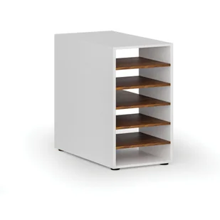 Z laminowanej płyty wiórowej o grubości 18 mm, ABS 1 mm, możliwość wkładania segregatorów z boku, 5 półek o grubości 18 mm + spód, wysokość między półkami 98,5 mm, widok z tyłu, regulowane ślizgacze o wysokości 17 mm do wyrównywania nierówności podłogi