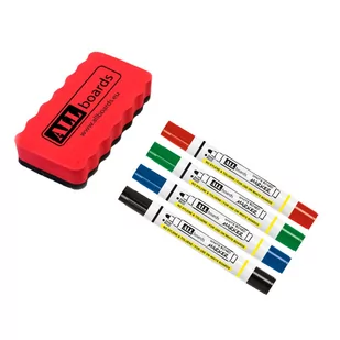 Zestaw składający się z gąbki magnetycznej i czterech markerów suchościeralnych (zielony, niebieski, czerwony, czarny). Produkt nie jest przeznaczony do użytku z tablicami szklanymi magnetycznymi.