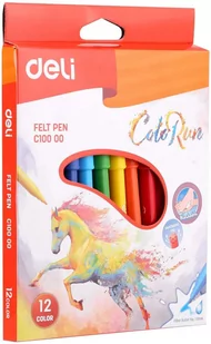 Flamastry szkolne DELI 12 sztuki Intensywna barwa tuszu flamastrów Deli to bezkonkurencyjnie jeden z większych atutów w każdej kategorii. Żywe, przepełnione emocjami kolory wydostają się w równomierny sposób poprzez okrągłą końcówkę, by ostatecznie zetknąć się z arkuszem papieru nasiąkając go. Mazaki będą idealnym produktem dla przedszkoli i szkół, gdyż ich nietoksyczna formuła zapewnia w pełni bezpieczne użytkowanie przez dzieci. Dodatkowym atutem jest ich łatwo zmywalny aspekt brudne rączki od dziś to nie problem. Każdy wkład zamknięty w plastikowym opakowaniu odpowiadającym jego kolorowi z chroniącą ściąganą skuwką, dzięki czemu produkt wytrzyma naprawdę długo bez jakiegokolwiek uszczerbku na jakości.