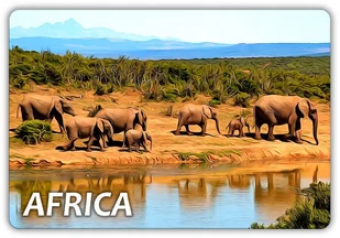Magnes na lodówkę - Souvenir - Pamiątka Ilustracja: AFRYKA - Słonie - Safari Wymiar: 95 mm x 65 mm Grubość: 1,6 mm Narożniki: zaokrąglone Rodzaj magnesu: twa...