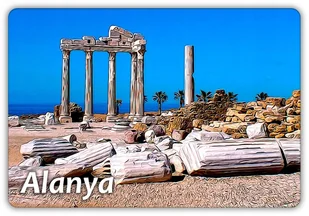Magnes na lodówkę - Souvenir - Pamiątka Ilustracja: ALANYA - TURCJA - Ruiny - Prowincja Antalya Wymiar: 95 mm x 65 mm Grubość: 1,6 mm Narożniki: zaokrąglone ...