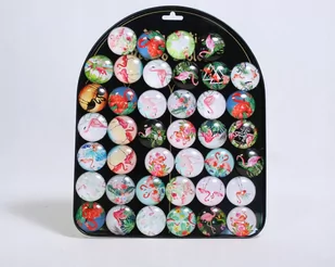 Szklane magnesy z flamingami. Średnica magnesu ok. 3,5 cm. Cena dotyczy 1szt. W sprzedaży kilkanaście różnych wzorów. Wysyłane losowo.
