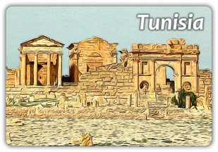 Magnes na lodówkę - Souvenir - Pamiątka Ilustracja: TUNEZJA - Sbeitla - Zabytki Wymiar: 95 mm x 65 mm Grubość: 1,6 mm Narożniki: zaokrąglone Rodzaj magnesu: ...