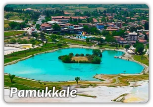 Magnes na lodówkę - Souvenir - Pamiątka Ilustracja: TURCJA - Pamukkale - Krajobraz - Park narodowy Wymiar: 95 mm x 65 mm Grubość: 1,6 mm Narożniki: zaokrąglo...