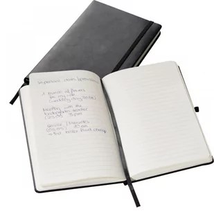 Notatnik A5 z okładką z imitacji skóry, 80 kartkami w linie, zakładką, miejscem na długopis i kieszonką na wewnętrznej stronie okładki. Zamykany elastyczną taśmą.