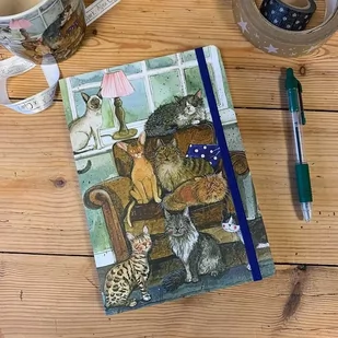 Ozdobny notatnik w formacie A5 z kartonową okładką i elastyczną gumką do zamykania. W środku znajduje się 96 stron w linie.