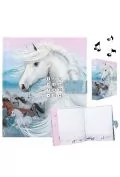 Pamiętnik na kod Miss Melody, na najskrytsze zapiski, po otwarciu przez chwilę gra modną piosenkę Infinity (ok.15-20sekund). W środku polska instrukcja, wymienne baterie. Wymiary pamiętnika to 3x15x20,5cm. Kartki w środku kartki z nadrukiem, kartki są w linie (widać na zdjęciu). Grubość. . .