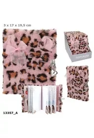 Pamiętnik TOPModel Cosy Cat ma puszyste różowo-brązowe futro z lamparta dookoła, urocze uszy z aplikacjami, haftowaną twarz kota i srebrny zamek w kształcie serca z dwoma kluczami. Wewnątrz. 96 drobno wyłożonych i kolorowo ilustrowanych stron do pisania. TOPModel pamiętnik z zamkiem różowy COSY CAT
