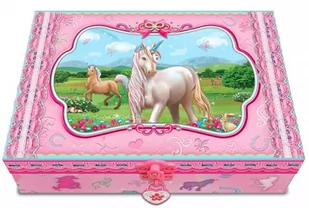 Zestaw artystyczny zapakowany w ozdobne pudełko z motywem jednorożców, zamykane na kłódeczkę. Bogate zdobienia i dekoracje przyciągną wzrok każdego użytkownika.