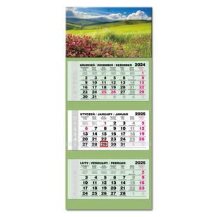 Kalendarz ścienny, trójdzielny LUX* kalendarz ścienny, trójdzielny z główką wypukłą !!!* wymiary: 33,5 x 76,5 cm* układ miesięczny z poprzednim i następnym miesiącem* posiada numerację tygodni, imieniny* nazwy miesięcy i dni tygodnia w języku polskim, angielskim, niemieckim* kalendaria w różnych kolorach do zrywania* opaska z okienkiem* doskonały do biura i dla firm