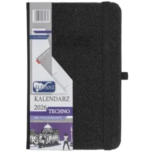 zamykany na gumkę w kolorze oprawygumka na długopis w kolorze oprawybrzegi kalendarza z kolekcji Techno są w kolorze kremowymzaokrąglone narożniki opraw i strontasiemka w kolorze oprawykoperta na odwrocie oprawy w kolorze kremowymukład: tygodniowy przejrzysty i jasny rozkład kalendarza Technowewnątrz: plan roku i rozkład roku 2026, terminy ferii zimowych, święta oficjalne i zwyczajowe, podróże, protokół powypadkowy w przypadku stłuczki, notes, skorowidz teleadresowy, kalendarium dodatkowe na 2025-2026-2027 rok