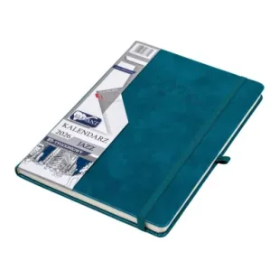 format B5 z tygodniowym układem środka kalendarza (tydzień na dwóch stronach) papier: delikatne chamois 80 g/m2 ilość stron: 178 oprawa: twarda wykonana z wysokiej jakości materiału imitującego skórę zamykany na gumkę w kolorze oprawy gumka na długopis w kolorze oprawy zaokrąglone narożniki opraw i stron dwie tasiemki w kolorze oprawy pierwsze strony wewnątrz wraz z kopertą na tylnej oprawie w kolorze kremowym układ: tygodniowy (tydzień na dwóch stronach) wewnątrz: