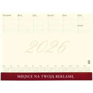 Elegancki podkład na biurko z dużym obszarem do notowania, drukowany na papierze kremowym. Uchylna listwa PCV w kolorze bordowym w dolnej części kalendarza. Na listwie istnieje możliwość wykonania nadruku reklamowego na obszarze 550 x 40 mm. układ: tygodniowy kalendarium PL papier 70g/m2; kremowy druk szaro bordowy format: 550 x 410 mm ilość kart: