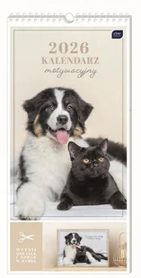 Kalendarz 2026 motywacyjny 22x46cm Zwierzaki. Kalendarz. Cechy: przy każdym dniu dużo miejsca na zapiski wyraźne i czytelne kalendarium zaznaczone imieniny, najważniejsze daty i święta po zużyciu kalendarza grafiki można wyciąć i oprawić ciekawa i inspirująca grafika motywacyjna z hasłem na każdy