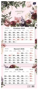 Kalendarz 2026 trójdzielny 82,5x34cm Kwiaty. Kalendarz. Cechy produktu: 3 odrębne kalendaria po 12 kartek opaska z przesuwanym okienkiem wyraźne i czytelne kalendarium zaznaczone imieniny, najważniejsze daty i święta format: 340 x 82,5 cmKraj produkcji: Pl